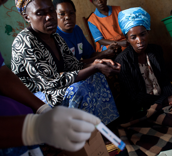 Tuberculosis patient Gertrude Chirwa looks expectantly at Evelyn Mwamsa, a counselor from the Community-Based Tuberculosis and HIV Organization who has come to Gertrude’s home to provide TB treatment and test her for HIV“If I test positive, can you give me the drugs now?”